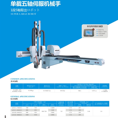 单截五轴伺服机械手的单截是指手臂假如上下行程为900MM,那么它高度就有900MM,它不适用于厂房较低的车间安装,而五轴是指横行使用1个伺服马达,1轴; 主臂用2个马达:升降1个、引拔1个,2轴; 副臂用2个马达:升降1个、引拔1个,2轴。五轴伺服机械手能仿照人的手和臂一些动作功用,以按固定程序抓取、搬运物件或操作东西的主动操作设备。机械手是较早呈现的工业机械也是较早呈现的现代机器人,尽管有点粗笨,却可以代替人的繁重劳作以完结出产的机械化和主动化,能在有害环境下操作以维护人身安全,虽不如人手灵敏,但它能不断重复工作和劳作,不知疲惫,不怕风险,力量比人手力大等。受到了很多部分的注重,因此广泛应用于机械制造、冶金、电子、轻工和原子能等部分。