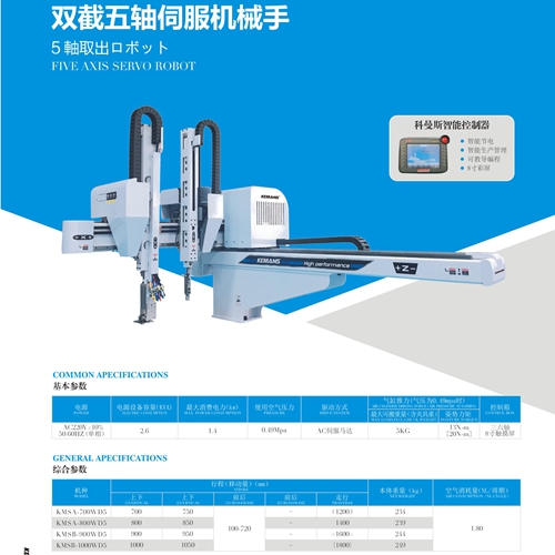 双截五轴伺服机械手的双截是指上下手臂的行程在900不变的情况下,而高度则可减少到450,双截的好处在于,一是上下运行速度较快,且适合厂房较低的车间安装。五轴伺服机械手适用于220T-600T的各型式身出成型机成品及水口取出,双截五轴伺服机械手的横行、引拔、手臂采用伺服驱动,手臂上下双截,引拔方通结构活动式,侧资为伺服侧姿组,取出时间快、调整治具方便。寿命长、故障低,取出时间较少1.8S,较大荷重10KG(含治具与成品),主要用于快速取出或复杂的取出应用,特别是长形产品如汽车产品,洗衣机家电等,